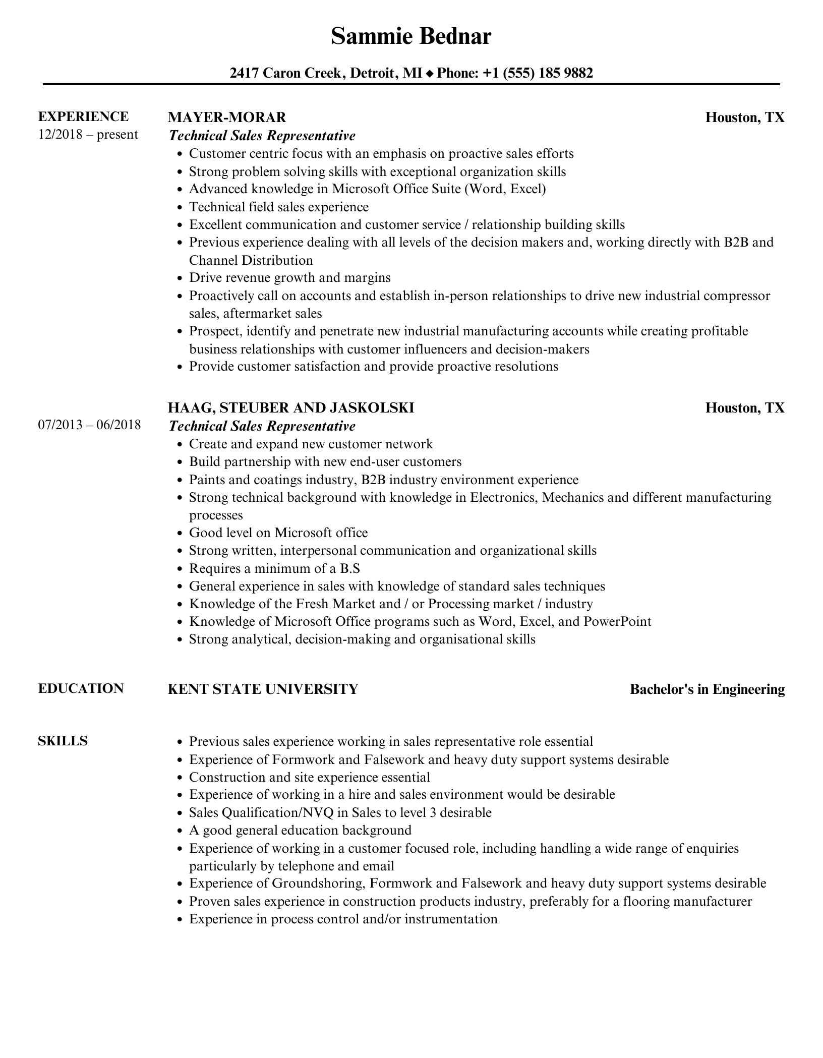 Senior Technical Sales Representative Carolinas Territory Resume Examples & Samples