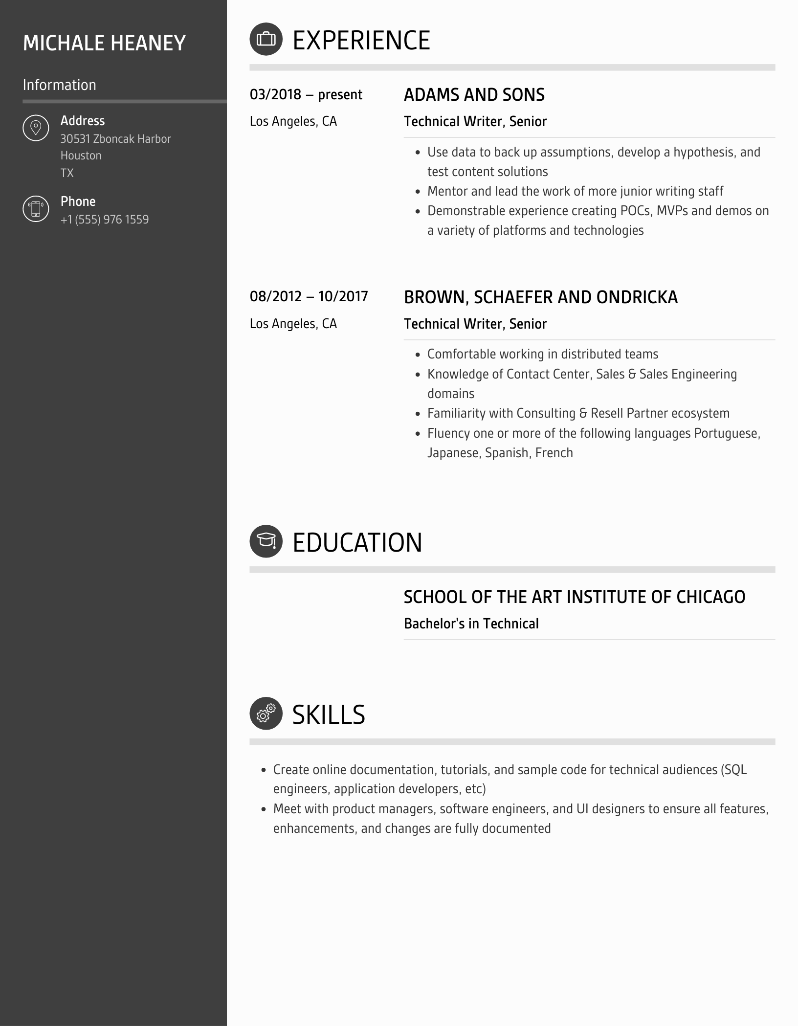 Guide the recruiter to the conclusion that you are the best candidate for the technical writer, senior job. It’s actually very simple. Tailor your resume by picking relevant responsibilities from the examples below and then add your accomplishments. This way, you can position yourself in the best way to get hired.