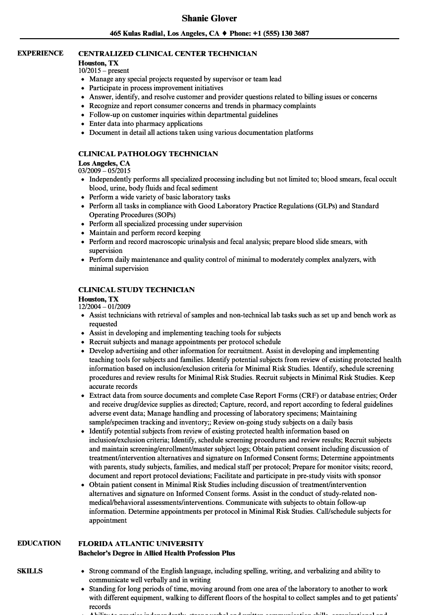 Guide the recruiter to the conclusion that you are the best candidate for the technician, clinical job. It’s actually very simple. Tailor your resume by picking relevant responsibilities from the examples below and then add your accomplishments. This way, you can position yourself in the best way to get hired.