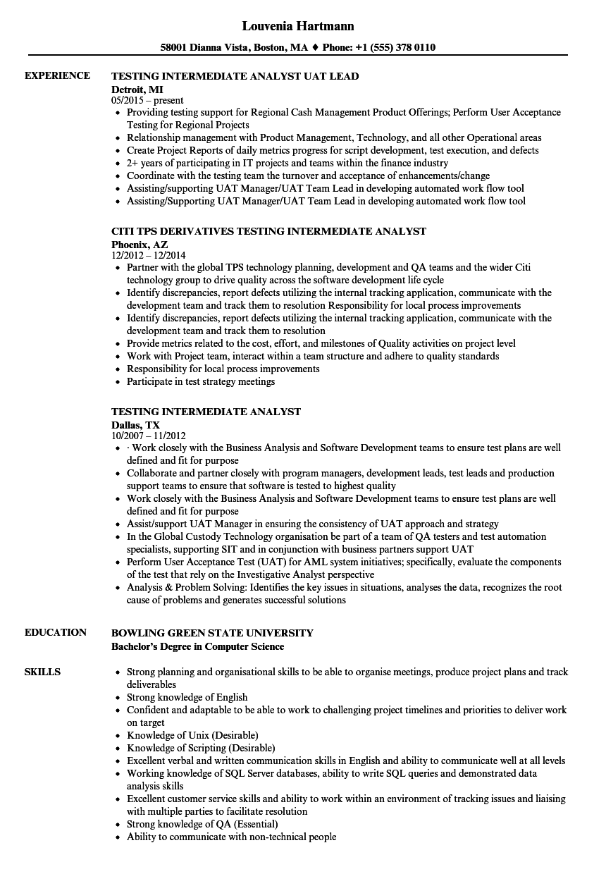 Guide the recruiter to the conclusion that you are the best candidate for the testing intermediate analyst job. It’s actually very simple. Tailor your resume by picking relevant responsibilities from the examples below and then add your accomplishments. This way, you can position yourself in the best way to get hired.
