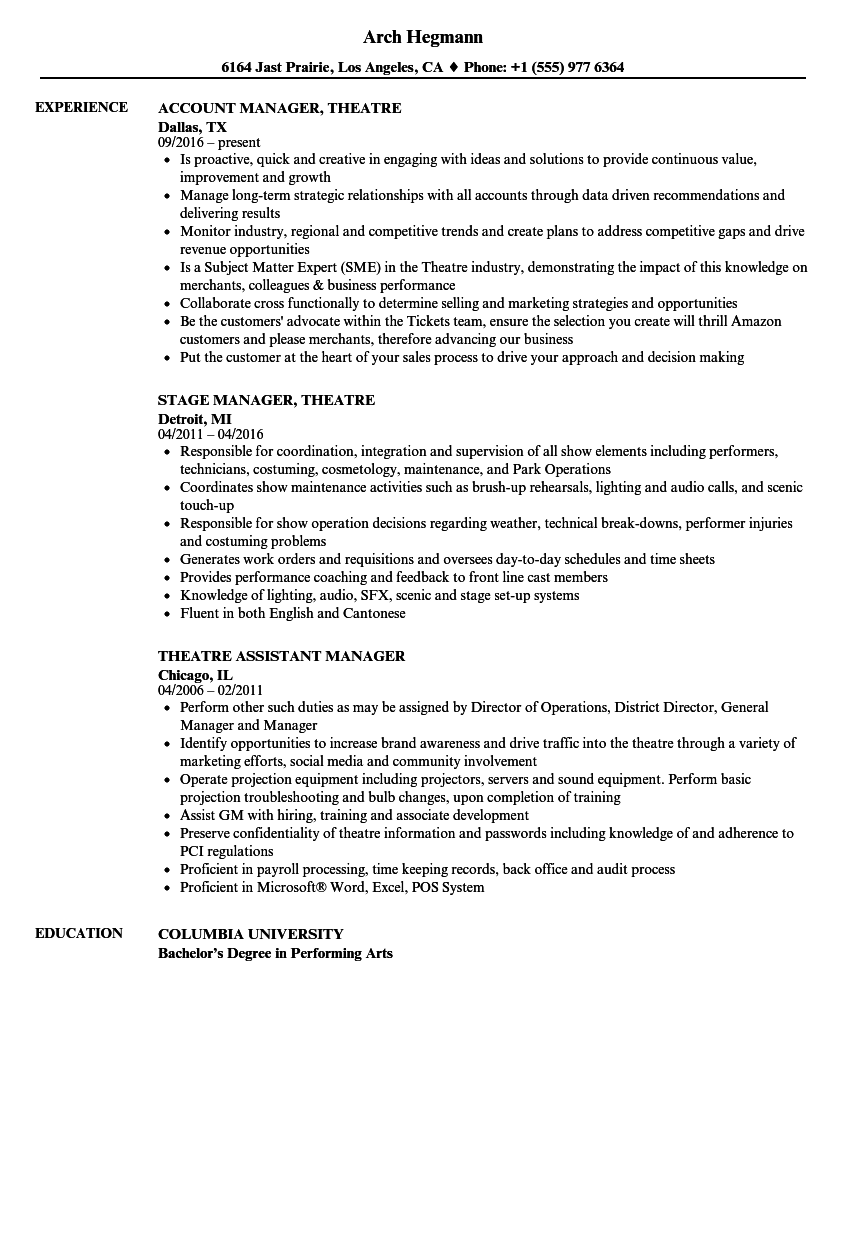 Guide the recruiter to the conclusion that you are the best candidate for the theatre manager job. It’s actually very simple. Tailor your resume by picking relevant responsibilities from the examples below and then add your accomplishments. This way, you can position yourself in the best way to get hired.
