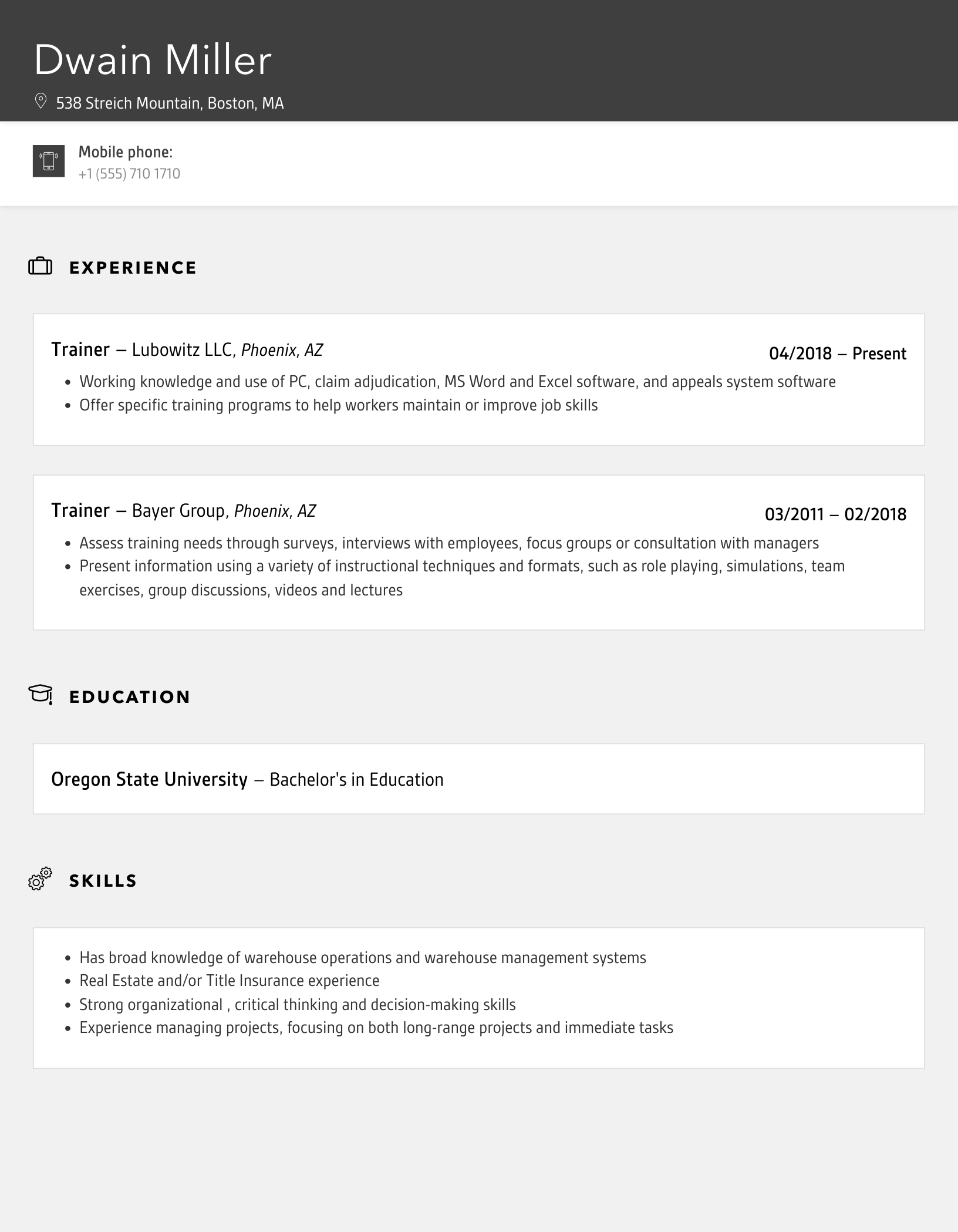 Guide the recruiter to the conclusion that you are the best candidate for the trainer job. It’s actually very simple. Tailor your resume by picking relevant responsibilities from the examples below and then add your accomplishments. This way, you can position yourself in the best way to get hired.