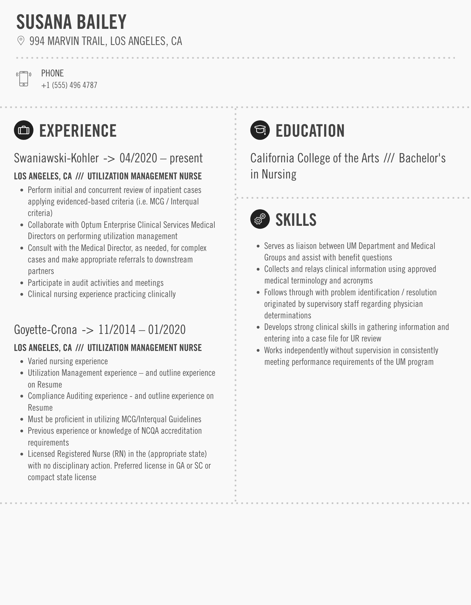 Guide the recruiter to the conclusion that you are the best candidate for the utilization management nurse job. It’s actually very simple. Tailor your resume by picking relevant responsibilities from the examples below and then add your accomplishments. This way, you can position yourself in the best way to get hired.