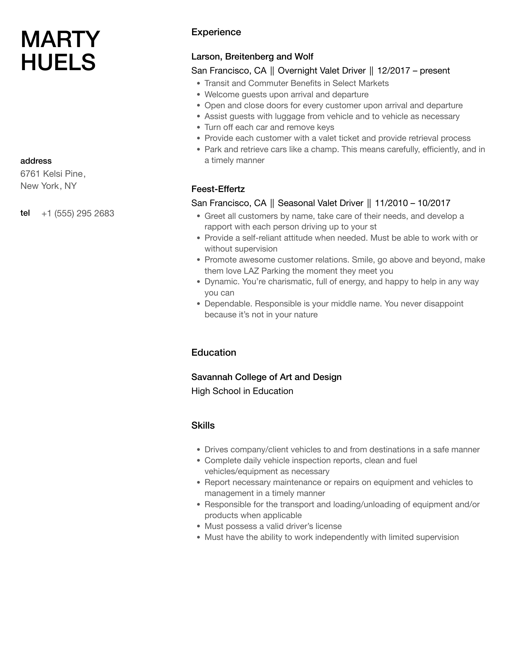Guide the recruiter to the conclusion that you are the best candidate for the valet driver job. It’s actually very simple. Tailor your resume by picking relevant responsibilities from the examples below and then add your accomplishments. This way, you can position yourself in the best way to get hired.