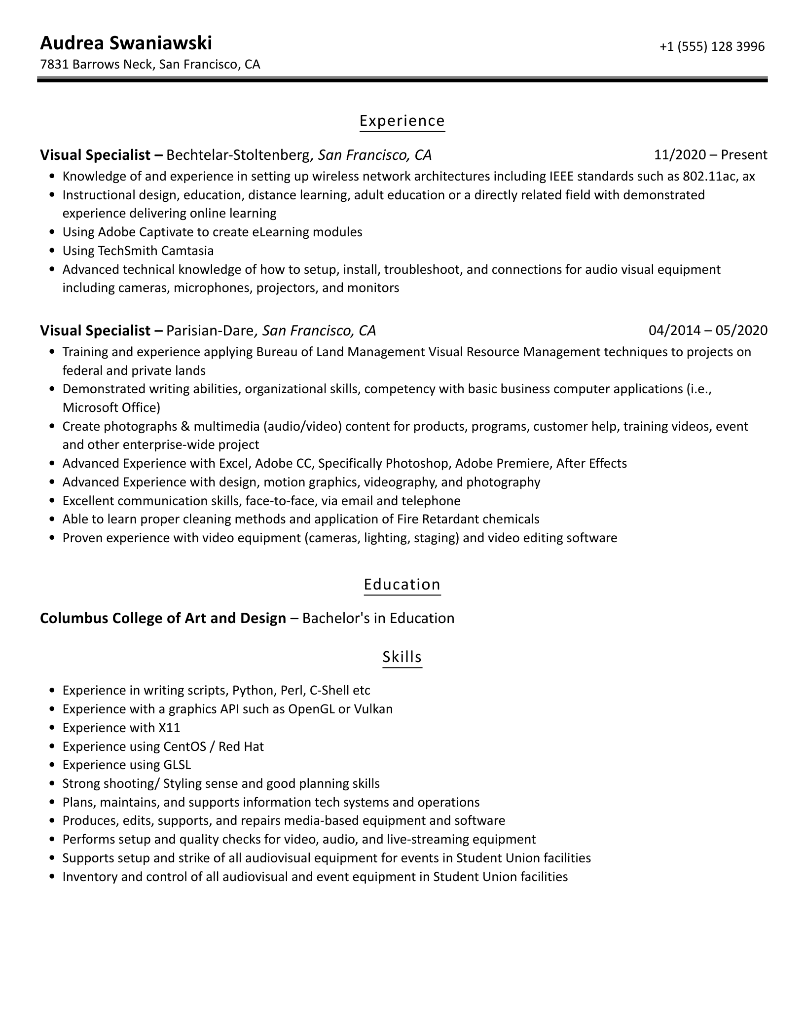 Audio Visual Specialist, Italian Resume Examples & Samples