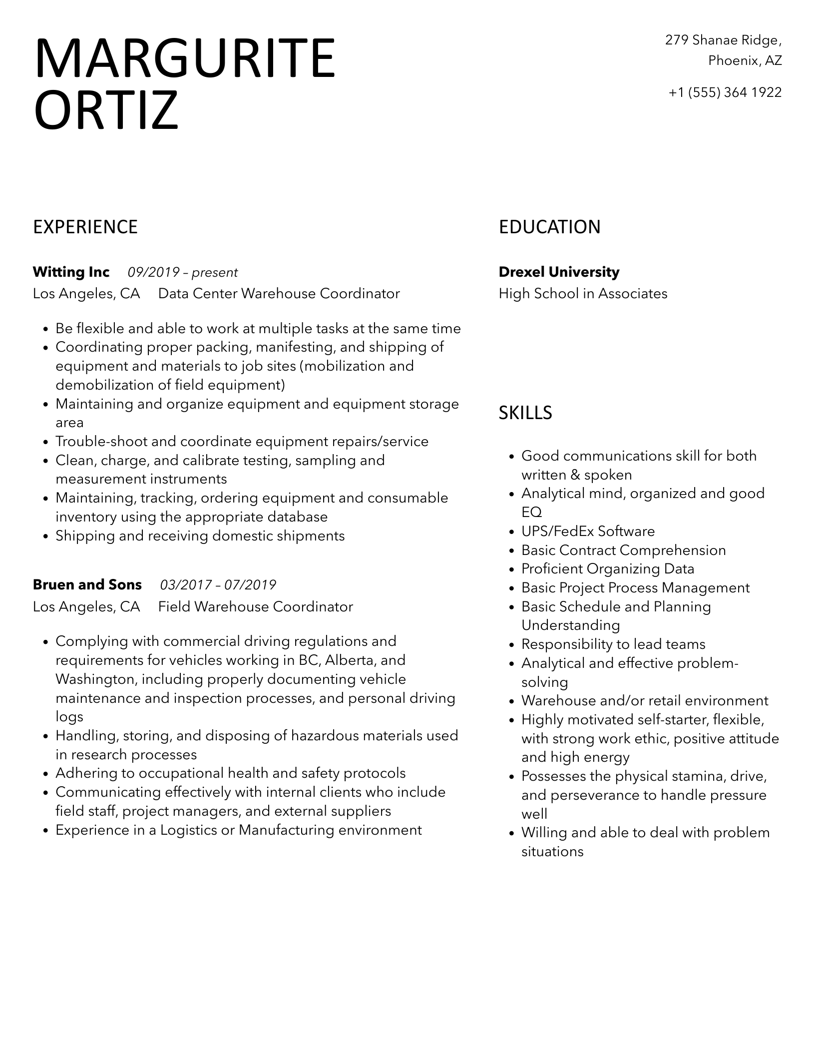 Off-site Warehouse Coordinator Resume Examples & Samples