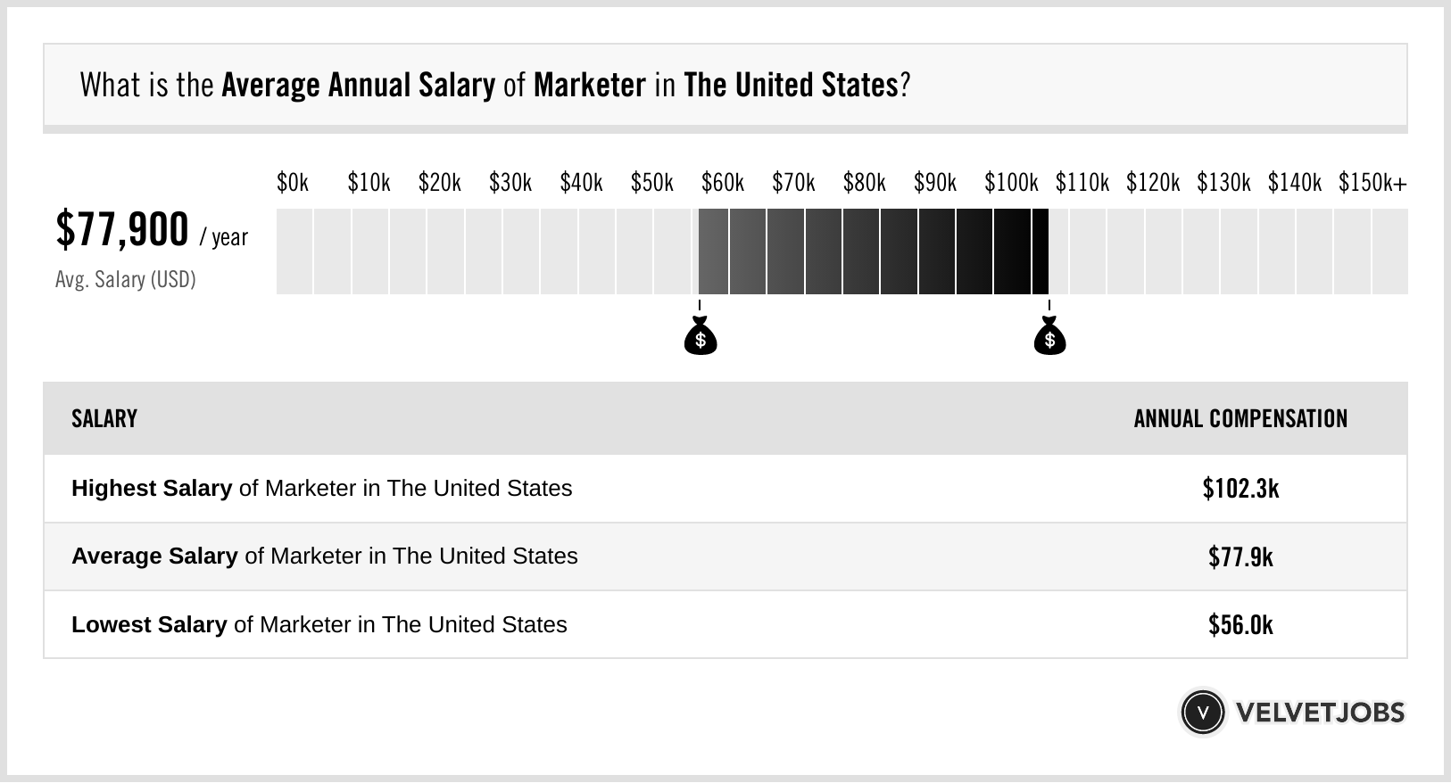 The average Marketer Salary in The United States is $77,900 per year. Salaries range from $56,000 to $102,300. The average Marketer Hourly Wage is $36.17 per hour. Hourly wages range from $20.00 to $50.40. Salaries and wages depend on multiple factors including geographic location, experience, seniority, industry, education etc.