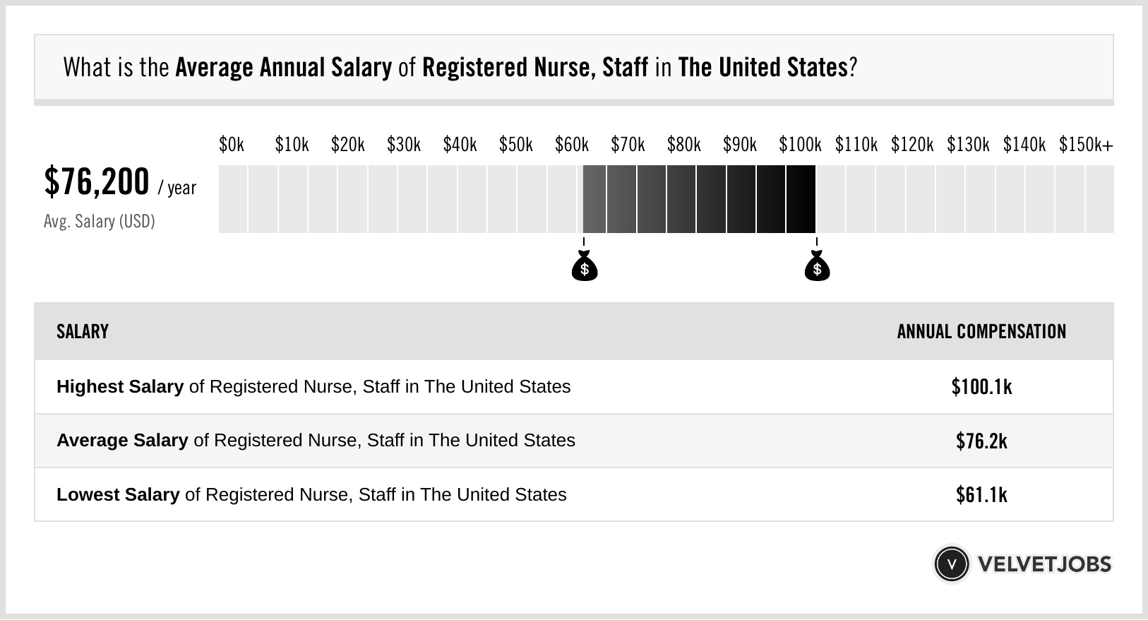 The average Registered Nurse, Staff Salary in The United States is $76,200 per year. Salaries range from $61,100 to $100,100. The average Registered Nurse, Staff Hourly Wage is $34.00 per hour. Hourly wages range from $27.30 to $44.70. Salaries and wages depend on multiple factors including geographic location, experience, seniority, industry, education etc.